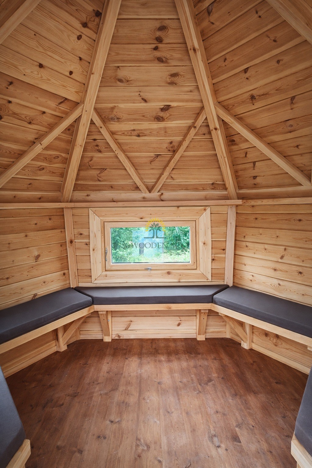 The sloped wall design enhances both the visual appeal and usable interior space, while the high-quality pinewood provides durability and natural insulation. This model is ideal for homeowners looking to upgrade their garden with a compact yet luxurious outdoor entertaining space.