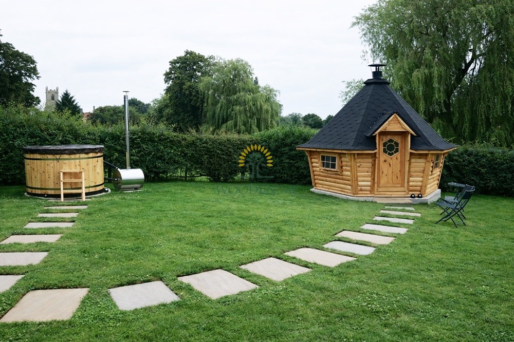 In addition to its spaciousness, the cabin features a central BBQ grill, a fitted table, and cushioned benches. Together, these elements create a warm, welcoming space where you can cook, dine, and relax with ease. Moreover, its robust pinewood construction, combined with double-glazed windows and Finnish bitumen shingles, guarantees long-lasting comfort and resilience.