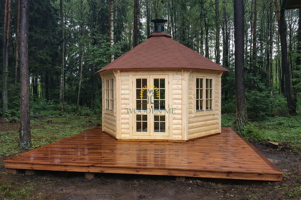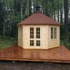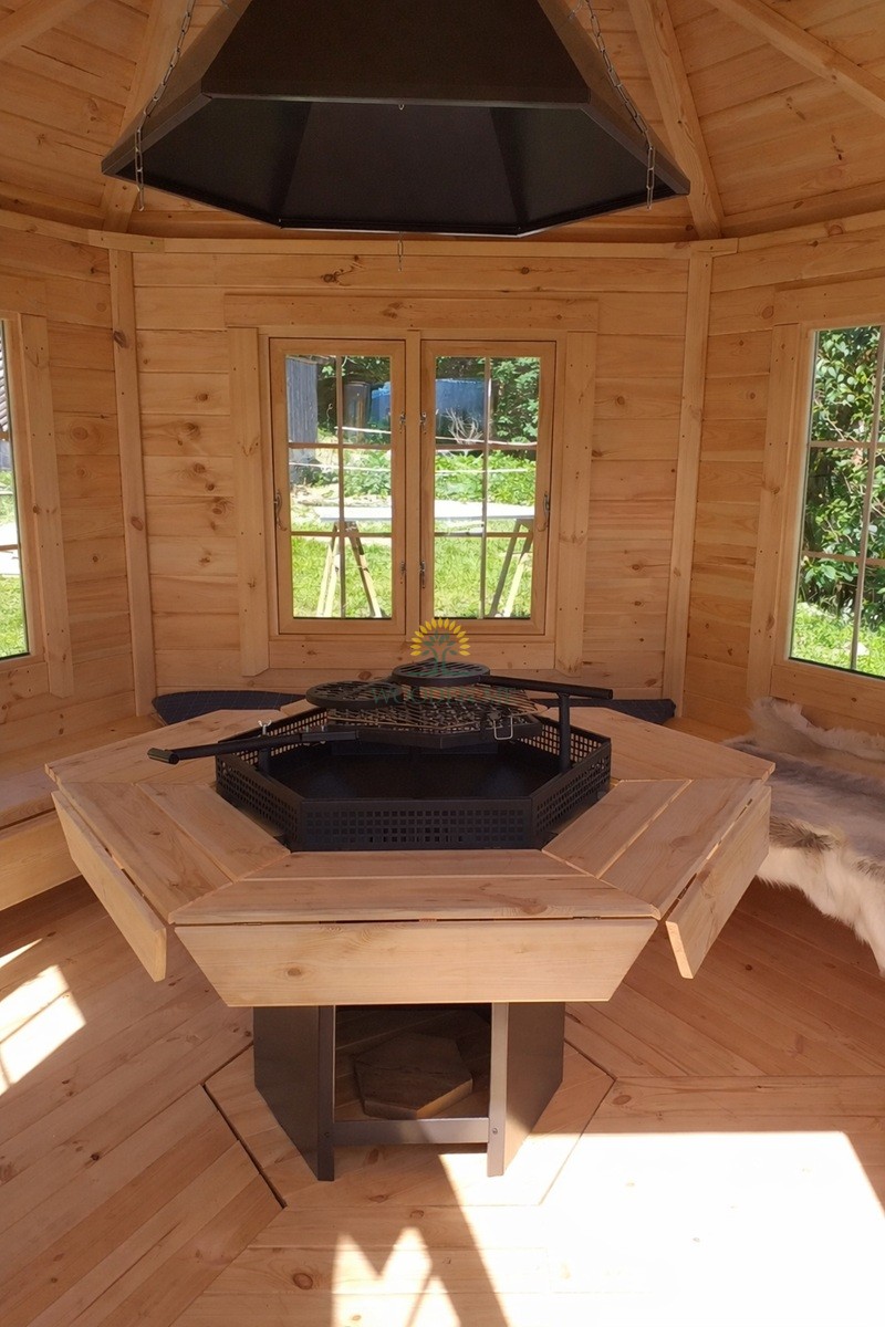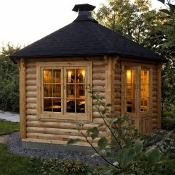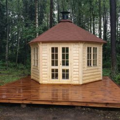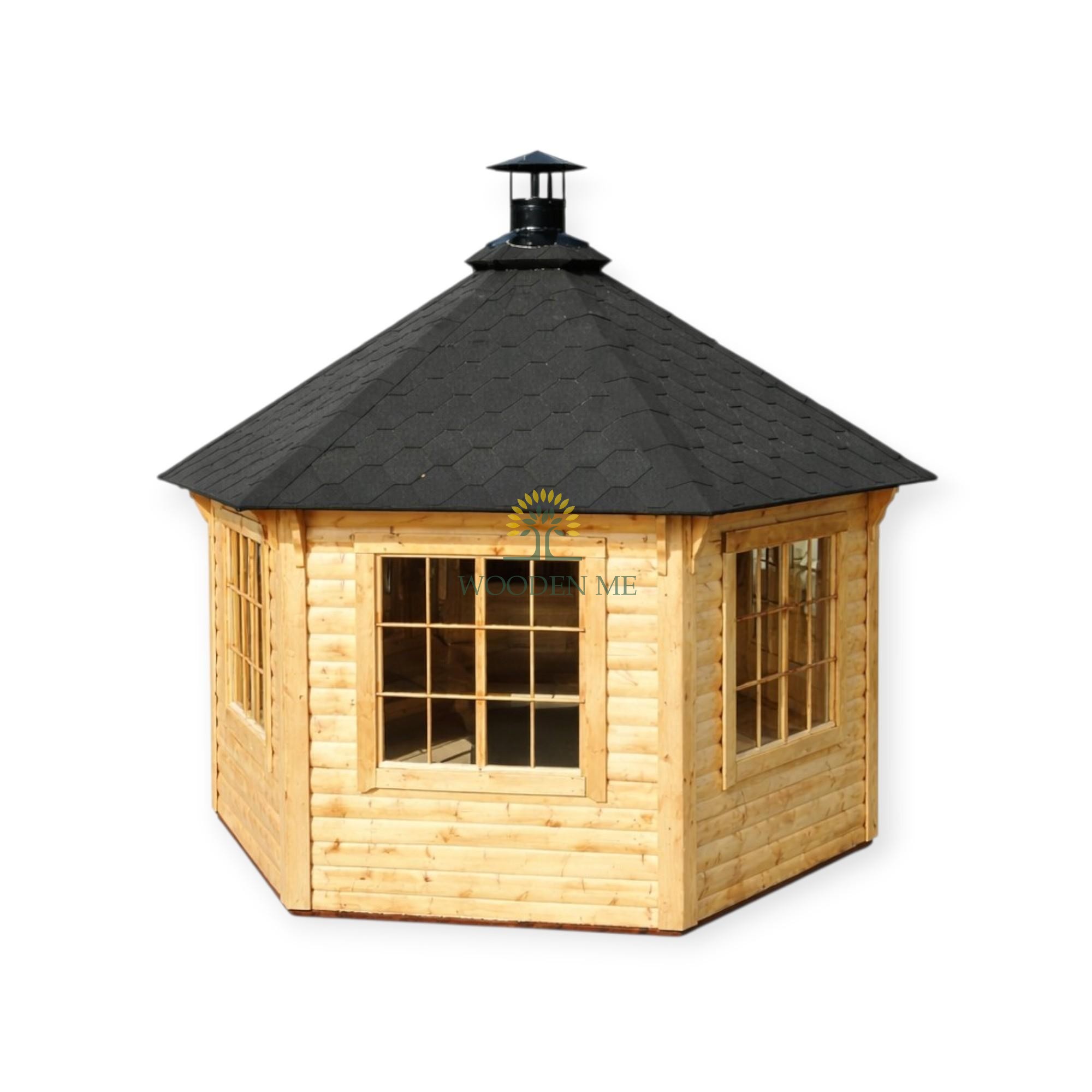 Enjoy open-air dining and outdoor gatherings with our Pavilion with Grill 9.2 m². Thanks to its open design, this spacious pavilion provides excellent functionality and comfortably accommodates 8–10 people. Therefore, it is ideal for family BBQs, social events, and relaxing afternoons in the garden. Notably, it features a central BBQ grill, a large fitted table, and sturdy benches, all of which create a welcoming and practical atmosphere for cooking, dining, and entertaining. Moreover, its durable pinewood structure, thick supporting beams, and Finnish bitumen shingles ensure lasting protection and timeless appeal. As a result, this pavilion not only enhances your outdoor space but also provides exceptional comfort and functionality throughout the year.