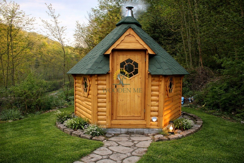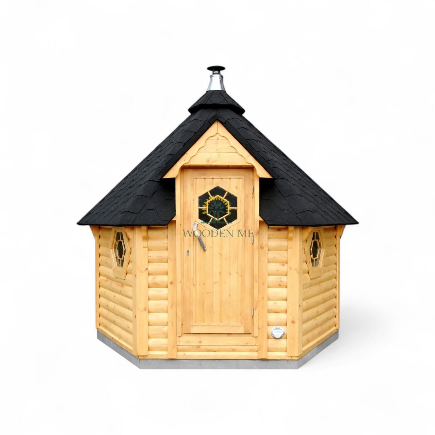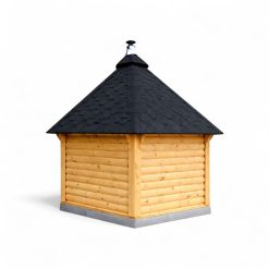 Moreover, the straight-wall design and pitched roof create a classic look that suits any garden or outdoor resort. In addition, two double-glazed hexagon windows and a lockable door with a matching glass pane ensure light, security, and visual harmony. What’s more, the 45 mm insulated roof covered with Finnish bitumen shingles guarantees comfort even in cold weather.
